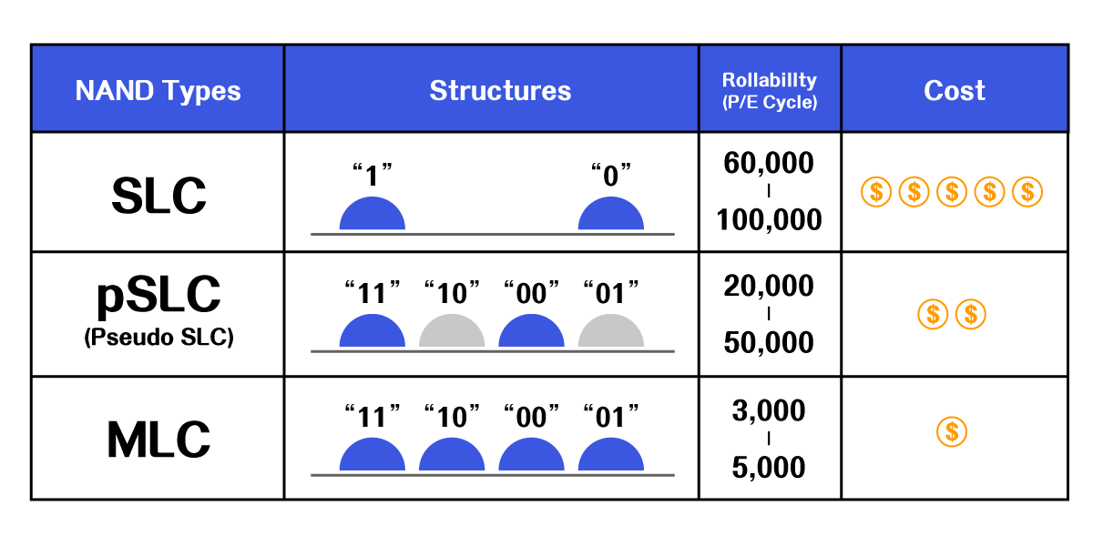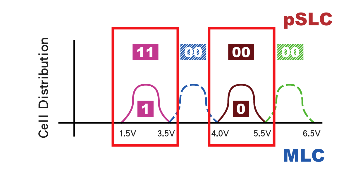 pSLC technology simulates MLC as an SLC Cell structure, and through the adjustment of SSD firmware and algorithm, the original one Cell unit storing 2-bit MLC NAND Flash, is simulated as the SLC storage model of 1 Cell storing 1 bit. Meltron provides Pseudo SLC (pSLC) solution that strikes a cost-performance balance between MLC and SLC flash types, making it an ideal alternative solution for heavy-write applications.